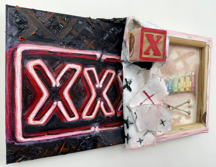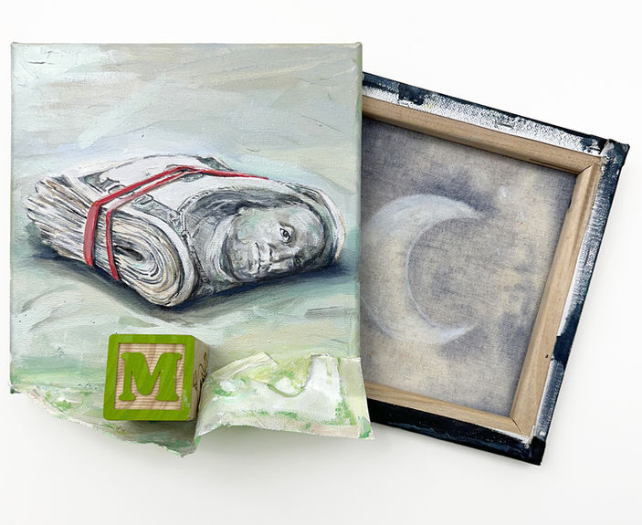 Across the series, I employ varied painting techniques and stylistic approaches, shifting between illusionistic realism, naïve rendering, and visible brushwork and material texture. Each work is constructed from two joined canvases one presenting the painted surface (the adult experience) and the other often revealing the raw reverse or "ghostly" imprint of the childhood theme. A 3D wooden corresponding alphabet block is integrated into each structure, anchoring the abstract concepts in physical reality. All the artworks are approximately 12 x 15 inches, oriented either horizontally, vertically or diagonally.